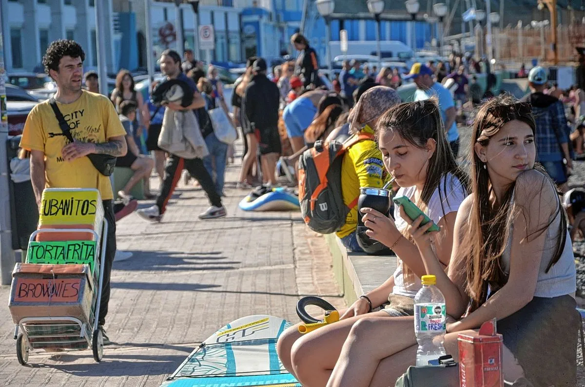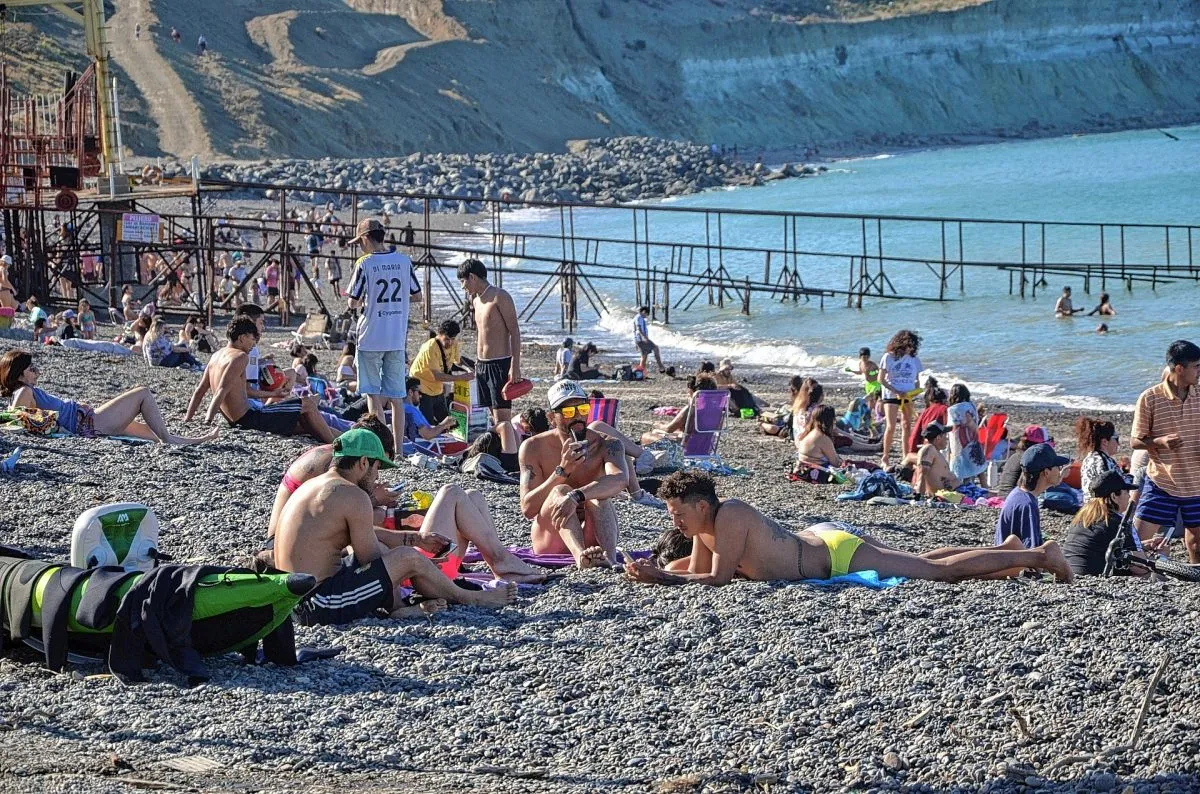 Cientos de personas se acercaron a la costanera céntrica, uno de los puntos con mayor convocatoria para jóvenes y familias, no solo para tomar sol, sino también para dar los primeros chapuzones de la temporada en el fresco mar comodorense.