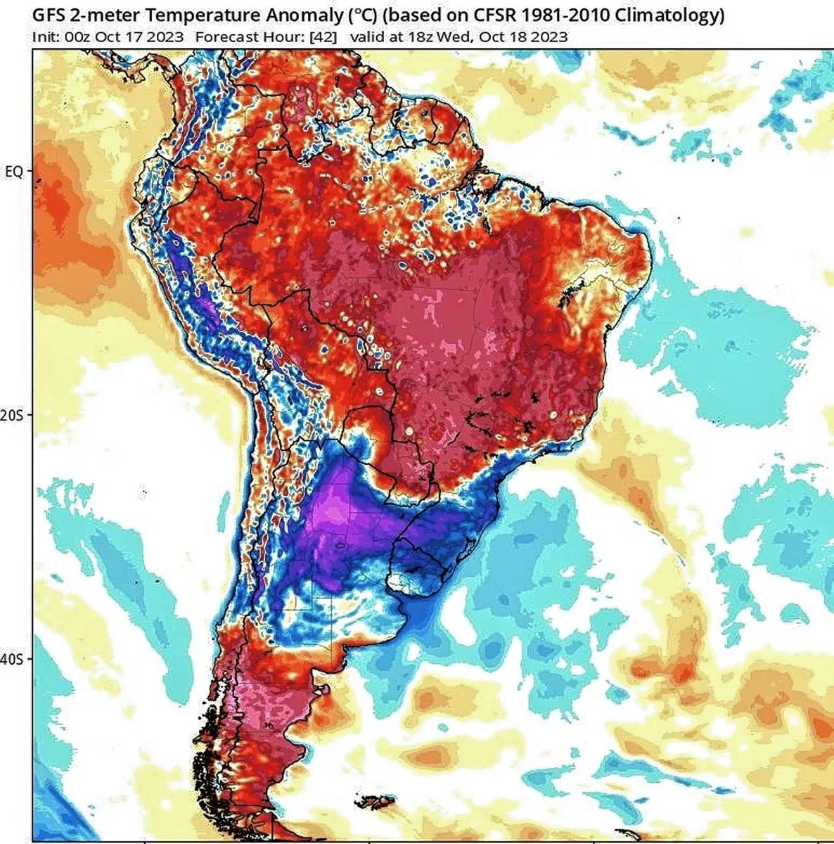 “En la región Patagónica se ve en colores rojos la anomalía positiva de temperatura a 2m, es decir valores por encima de lo normal, para el día miércoles 18, con respecto al período 1981-2010. En colores azules y violetas se ven anomalías negativas, lo que serían valores por debajo de lo normal, están en el centro y norte del país debido a la presencia del anticiclón mencionado y de un frente frío en las provincias del norte”, especificó.