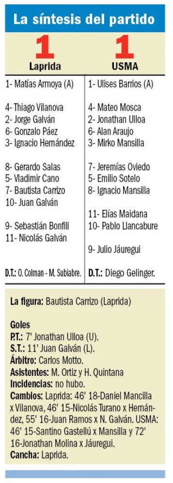 Laprida y USMA terminaron anoche igualados en uno. En el primer tiempo, Jonathan Ulloa adelantó al "azulgrana" y en el complemento empató Juan Galván. Se mantiene la diferencia de dos puntos entre ambos, en la pulseada por evitar la Promoción.