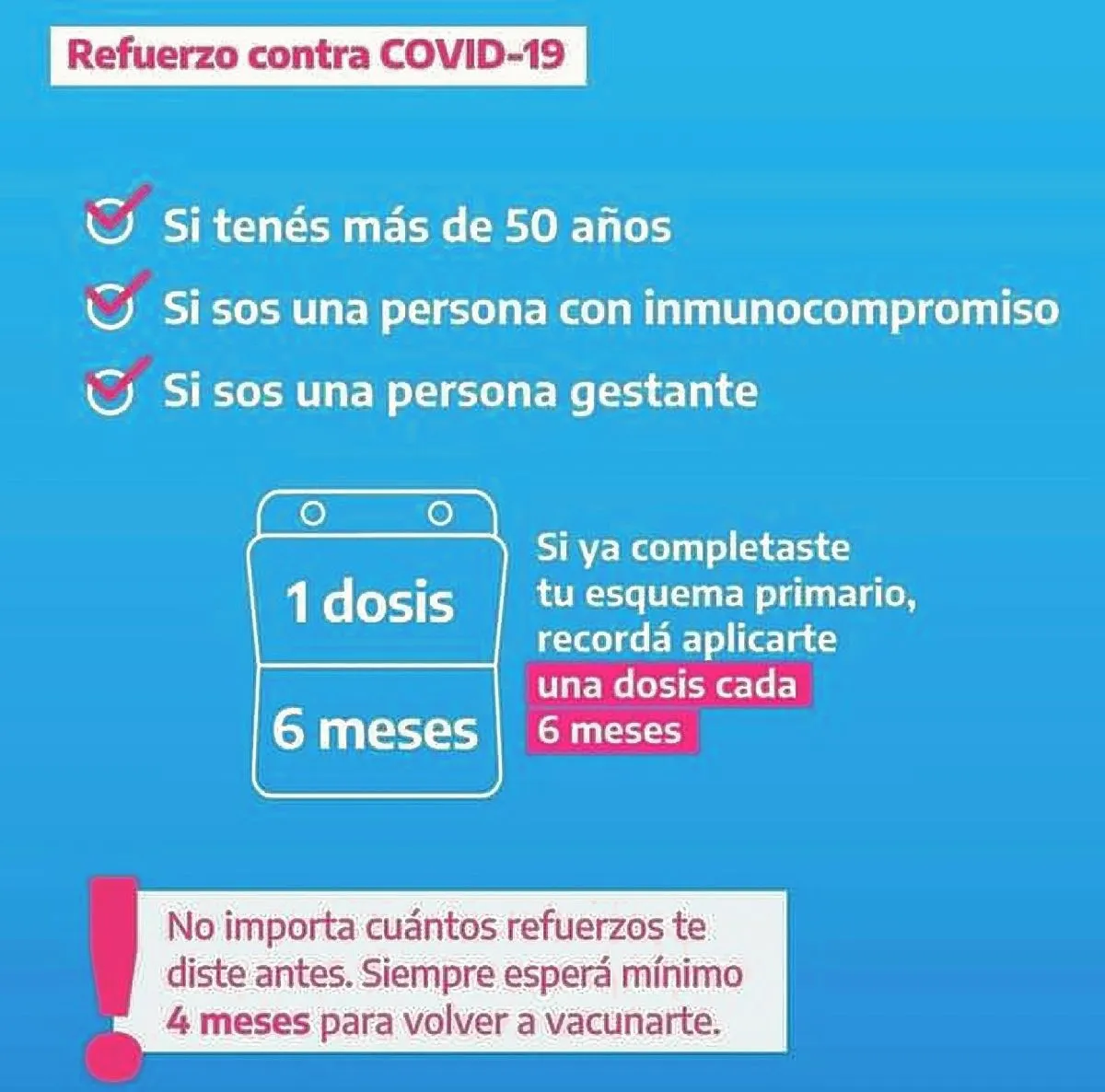 Riesgo alto de COVID-19 grave: personas de 50 años o mayores, personas gestantes y personas con inmunocompromiso a partir de los 6 meses de vida. Se aplicará una dosis de refuerzo a los seis (6 meses desde la última dosis aplicada y continuará con la misma periodicidad (cada 6 meses).