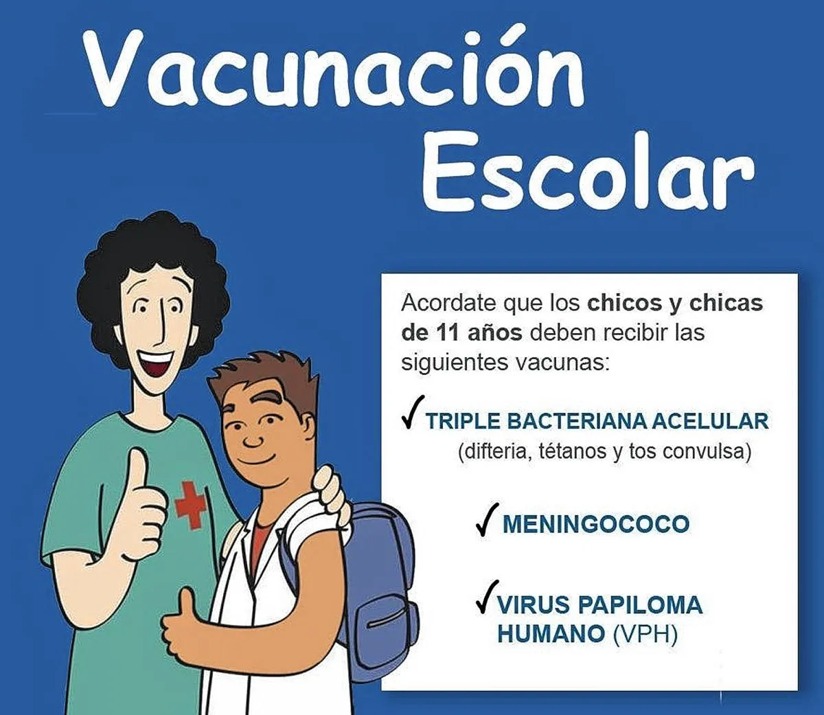 Por su parte, los chicos y las chicas de 11 años deben recibir la vacuna Triple Bacteriana Acelular, que previene la Difteria, el Tétanos y la Tos Convulsa; la vacuna contra el Virus del Papiloma Humano (VPH), que previene el cáncer de cuello uterino en las niñas y otros cánceres relacionados al VPH tanto en mujeres como en hombres; y, finalmente, una dosis de la vacuna contra el Meningococo.