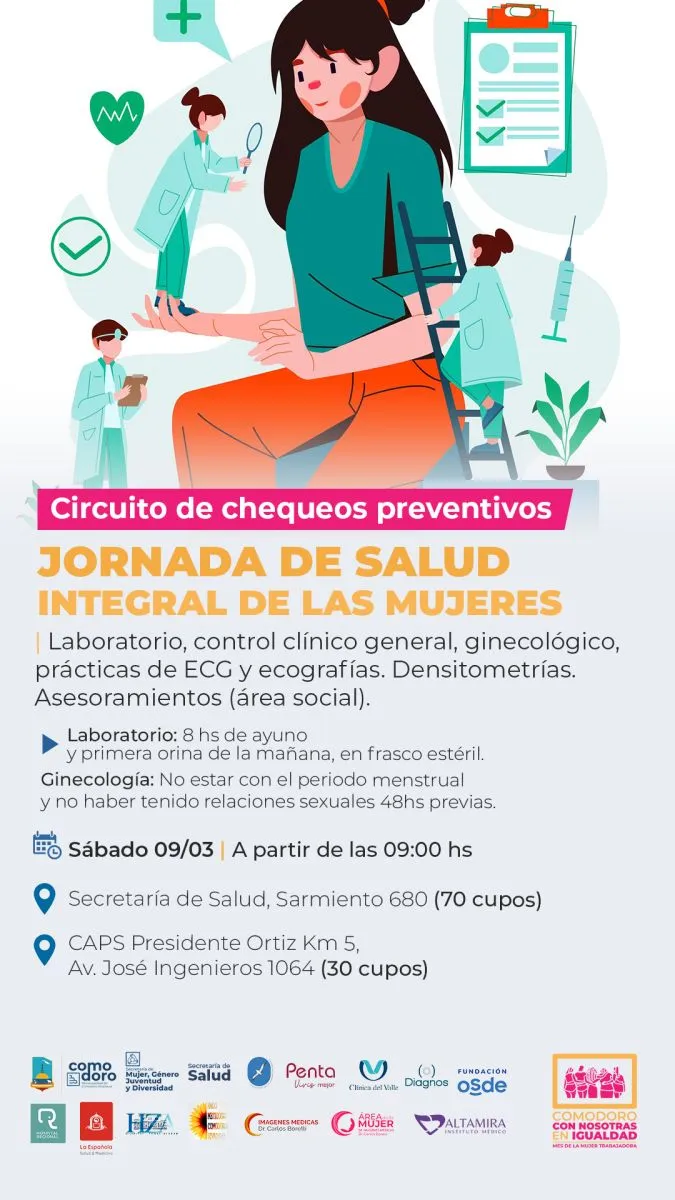 En el marco del Día Internacional de la Mujer Trabajadora, y bajo el lema “Con nosotras en Igualdad”, la Municipalidad de Comodoro Rivadavia, a través sus distintas áreas, realiza diferentes actividades. En ese contexto, este sábado, la Secretaría de Salud llevará adelante una jornada integral de atención a mujeres, realizando PAP, análisis clínicos, ecografías, mamografía y, si es necesario, densitometría y Vitamina D, de manera gratuita.