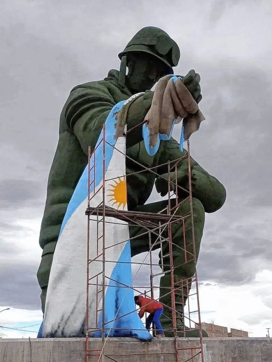 Hace unos días atrás la obra “tomó color”, adoptando el característico verde militar, mientras que el próximo paso es culminar las tareas de pintura con el celeste y blanco de la Bandera Argentina que lleva el soldado en uno de sus brazos y además, finalizar la plaza seca que rodeará la escultura, donde se construirá una ermita con la imagen de la Virgen de Luján.