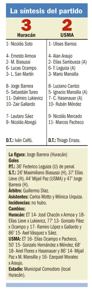 La cancha se fue inclinando por amarillas, foules en cercanías del área y múltiples intentos con pelota parada. A los 26’ Maximiliano Biasussi cabeceó un córner para el 1-1 y Huracán pareció liberarse, Abregú lo tuvo una y otra vez, ya con USMA condicionado. Tanta fue la presión que el Globo logró desnivelar por la misma vía. El ingresado Elías Lieve anticipó en el primer palo un preciso centro de Barrera para el 2-1 en un desahogo que duró lo mismo que un flash.
