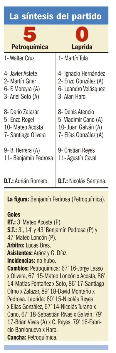Y allí ya se acabó la energía de Laprida, quedaba media hora que sirvió para dos agregados: la contundencia de Petroquímica para anotar dos goles más con Pedrosa y Mateo Loncón, además de un excesivo descuento que sirvió para caldear un ambiente que terminó innecesariamente desprolijo.