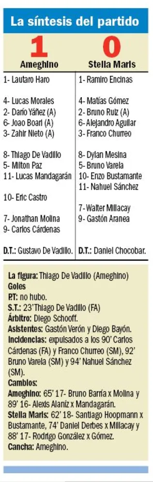 En el cierre el árbitro Schooff disciplinó con rojas. Se fueron Carlos Cárdenas y Churreo tras una discusión; Bruno Varela y al final Sánchez ya cuando se cumplía tiempo agregado. A Ameghino le sirvió sumar, muy lejos de brillar, pero acomodando el barco después de la tormenta.