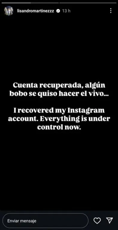 Cuenta recuperada, algún bobo se quiso hacer el vivo…”, el mensaje de la historia de la cuenta de Lisandro Martínez.