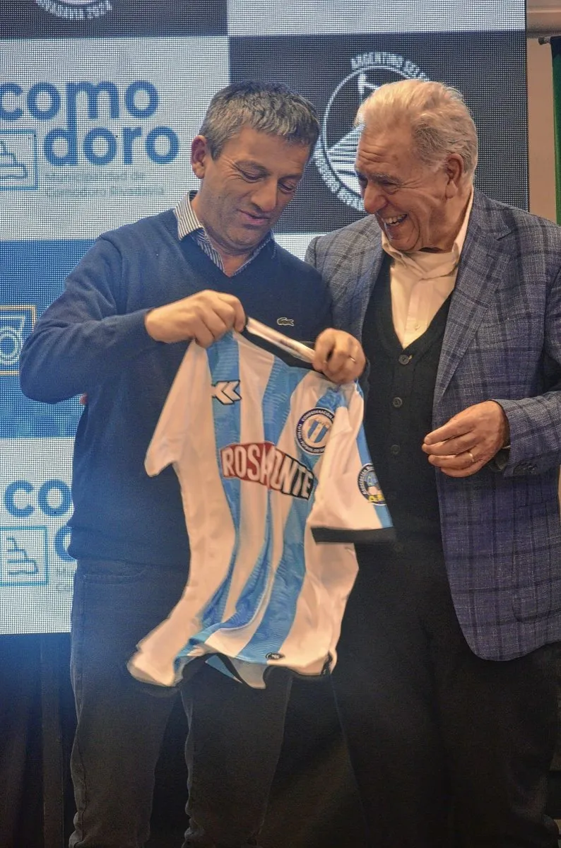 El dirigente José María Ferreyra de las Casas, entrega una camiseta al titular de Chubut Deportes, Milton Reyes.