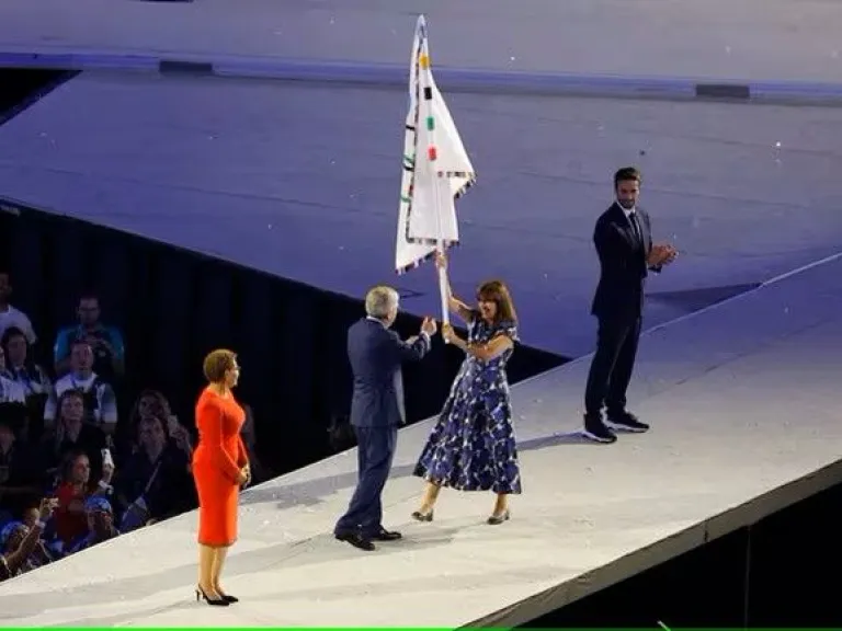 Tras el himno olímpico, se realizó el traspaso de banderas. La alcaldesa de París, Ana María Hidalgo Aleu, le entregó el estandarte a la funcionaria de Los Ángeles, Karen Bass, en el puente que une metafóricamente a ambos pueblos.