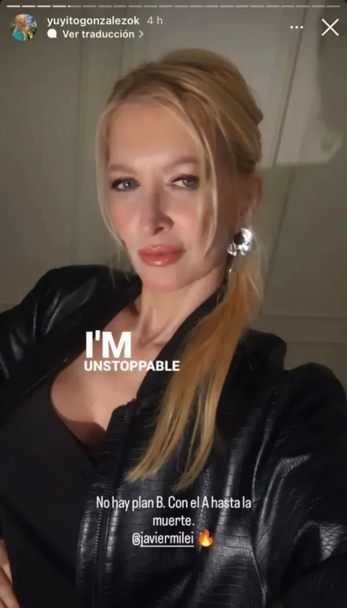 De igual manera, este jueves 29 de agosto, González sorprendió a sus seguidores en las redes sociales con una contundente declaración. A través de las historias de Instagram, la exvedette publicó una fotografía tipo selfie y escribió: “No hay plan B. Con el A hasta la muerte”. A su vez, acompañada de la canción “Unstoppable” de Sia, la presentadora televisiva mencionó la cuenta de Javier Milei y sumó un emoji con forma de fuego.