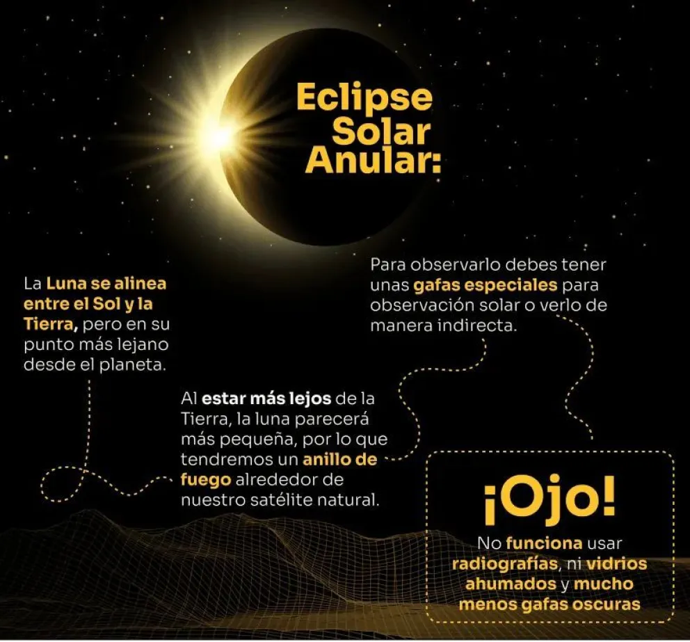 Un eclipse solar anular ocurre cuando el Sol, la Luna y la Tierra se alinean perfectamente. A diferencia de un eclipse total, donde la Luna cubre completamente al Sol, en este caso la Luna es más pequeña que el Sol, creando un borde brillante alrededor de su sombra.