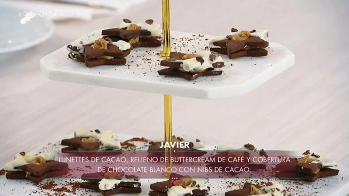 El músico preparó unas lunettes de cacao rellenas con buttercream de café, cubiertas de chocolate blanco con nibs de cacao. Lamentablemente, el color marrón que tenían no era por el cacao, sino que estaban quemadas.