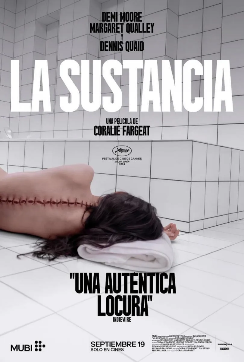 ¿Alguna vez has soñado con una mejor versión de ti misma? Tú. Sólo que mejor en todos los sentidos. Tienes que probar este nuevo producto. Se llama La Sustancia. Genera otra tú. Una nueva tú, más joven, más bella, más perfecta. Y sólo hay una regla: compartes el tiempo. Una semana para ti. Una semana para la nueva tú. Siete días cada una. Un equilibrio perfecto. Fácil. ¿Verdad? Si respetas el equilibrio... ¿qué podría salir mal? La película tuvo su estreno mundial en la 77.ª edición del Festival Internacional de Cine de Cannes, en donde causó sensación y ganó la Palma de Oro por su guión.