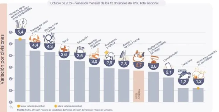 Las dos divisiones que registraron las menores variaciones en octubre de 2024 fueron Transporte (1,2%) y Alimentos y bebidas no alcohólicas (1,2%).