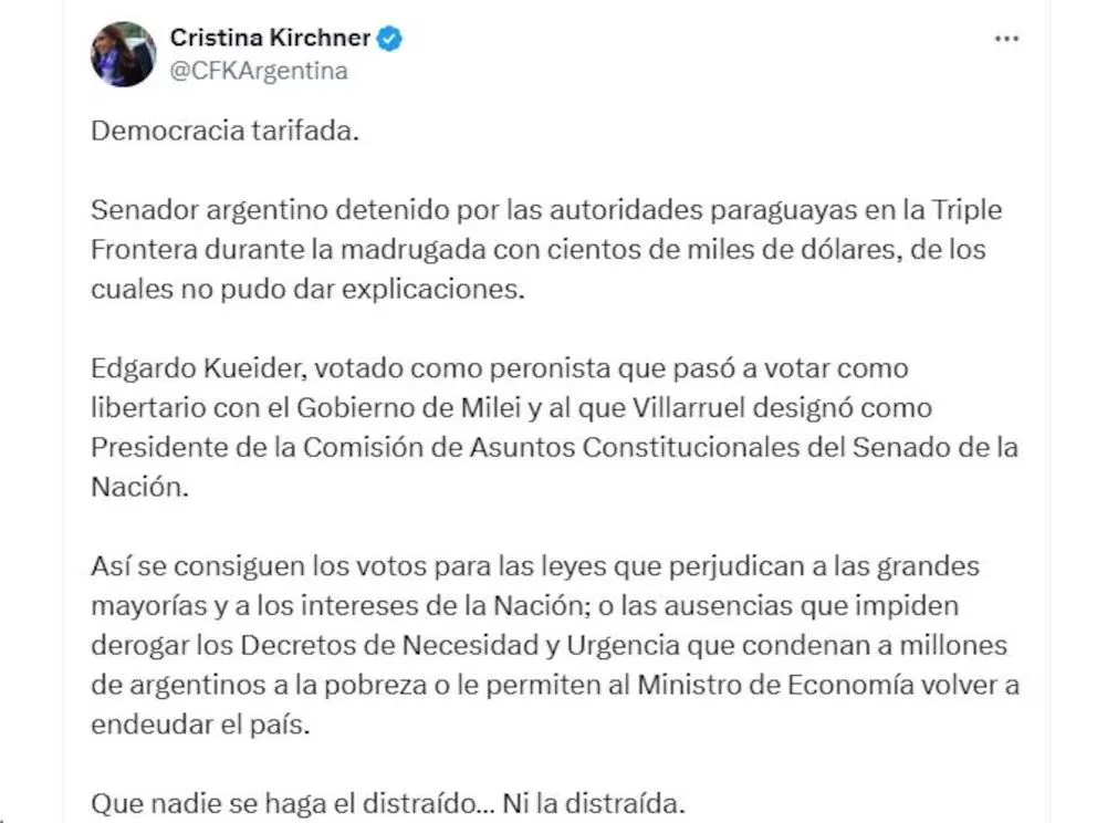 “Democracia tarifada”, introdujo en un tuit. Y desarrolló: “Senador argentino detenido por las autoridades paraguayas en la Triple Frontera durante la madrugada con cientos de miles de dólares, de los cuales no pudo dar explicaciones. Edgardo Kueider, votado como peronista que pasó a votar como libertario con el Gobierno de Milei y al que Villarruel designó como Presidente de la Comisión de Asuntos Constitucionales del Senado de la Nación”.