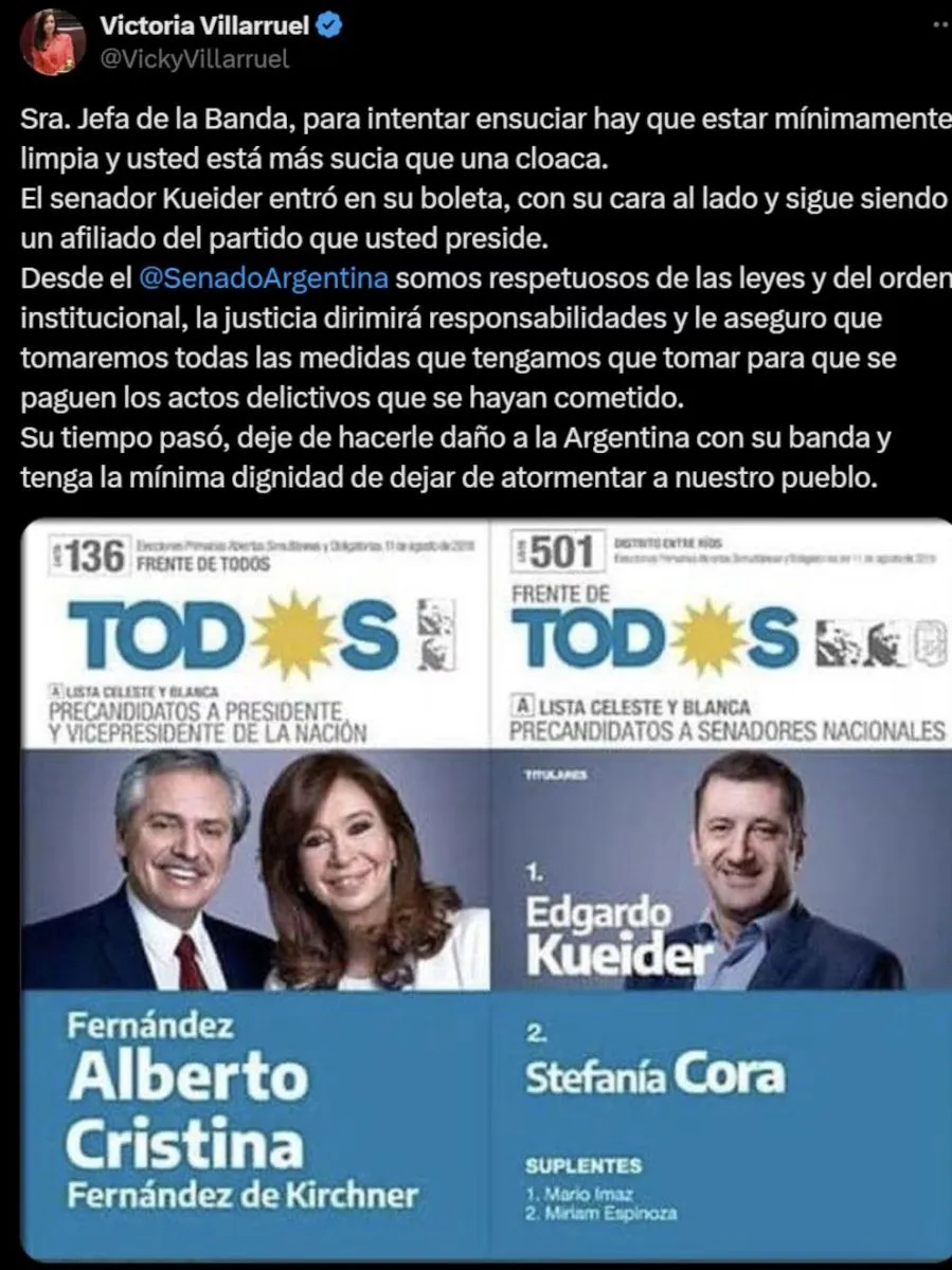 “Sra. Jefa de la Banda, para intentar ensuciar hay que estar mínimamente limpia y usted está más sucia que una cloaca. El senador Kueider entró en su boleta, con su cara al lado y sigue siendo un afiliado del partido que usted preside”, escribió Villarruel en sus redes sociales.