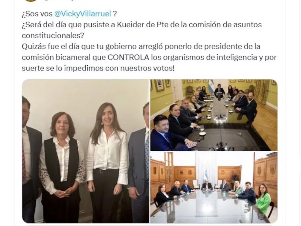 Desde el kirchnerismo, la senadora Juliana di Tullio compartió en sus redes sociales una foto de la Vicepresidenta con el senador detenido e ironizó: “¿Sos vos Victoria Villarruel? ¿Será del día que pusiste a Kueider de presidente de la comisión de asuntos constitucionales? Quizás fue el día que tu gobierno arregló ponerlo de presidente de la comisión bicameral que controla los organismos de inteligencia y por suerte se lo impedimos con nuestros votos!”.