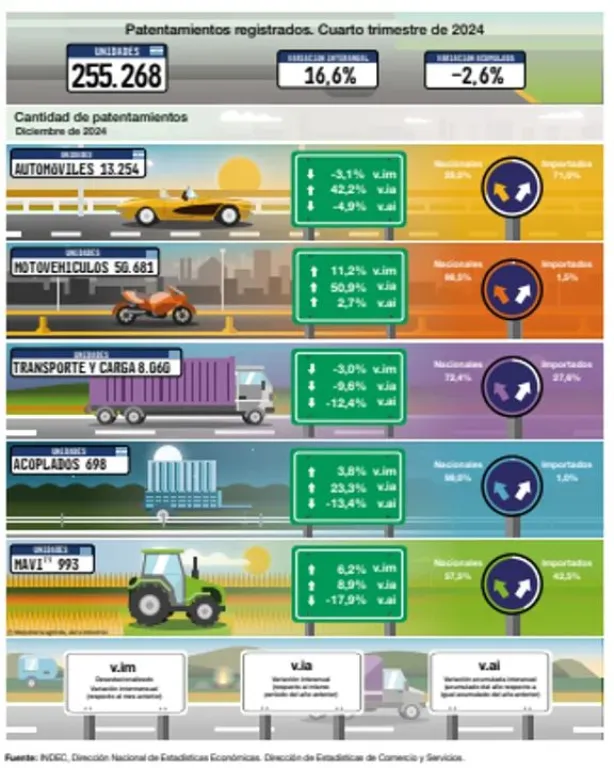 El índice de patentamientos del organismo estatal arrojó que durante el octubre, noviembre y diciembre del año pasado se registraron 255.268 unidades en todo concepto (automóviles, motovehiculos, transporte y carga, acoplados y maquinaria agrícola, vial e industrial).