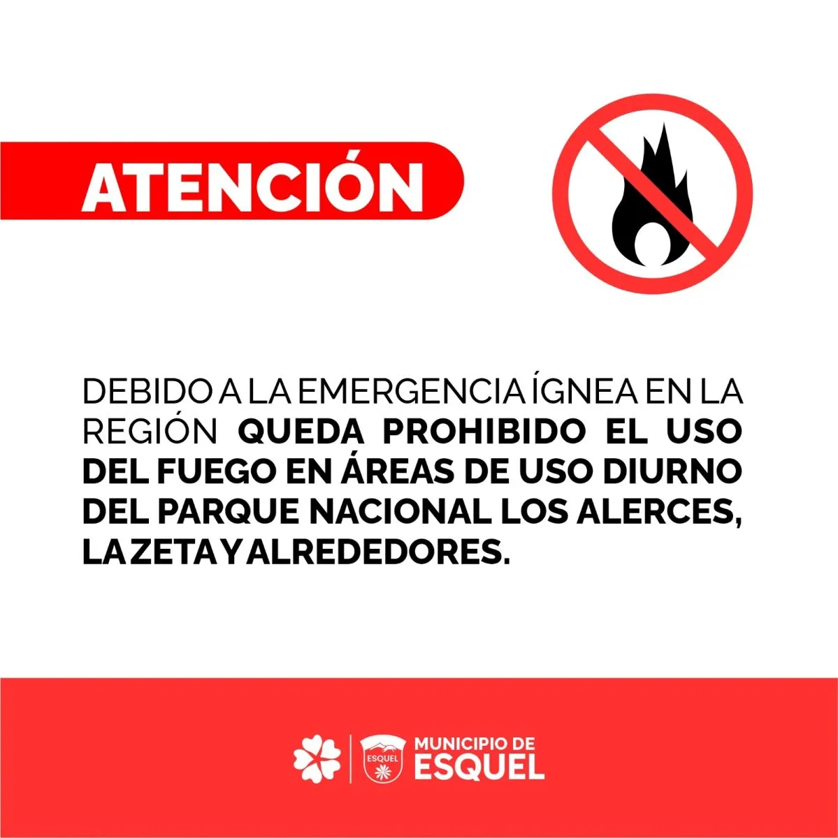 Asimismo, la Municipalidad de Esquel informa que, ante esta situación a nivel regional y el alto índice de peligro de incendios, queda totalmente prohibido hacer fuego en las zonas de uso diurno como la Laguna La Zeta, Alto Río Percy y el Parque Nacional Los Alerces.