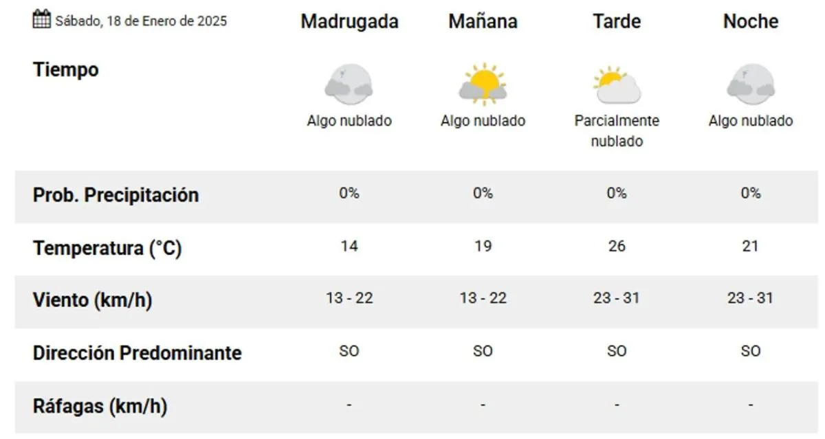 Por la madrugada, arranca con una mínima de 14° y algunas nubes, pero sin preocupaciones de lluvias ni ráfagas fuertes. A medida que avanza la mañana, la temperatura subirá a 19° con un poco más de sol.
