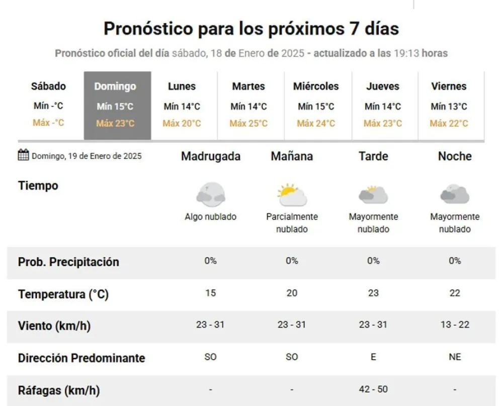 Este domingo 19 de enero, Comodoro Rivadavia y Rada Tilly disfrutarán de un día agradable, según lo anticipado por el Servicio Meteorológico Nacional. Se espera una temperatura mínima de 15ºC y una máxima que podría alcanzar los 23ºC.