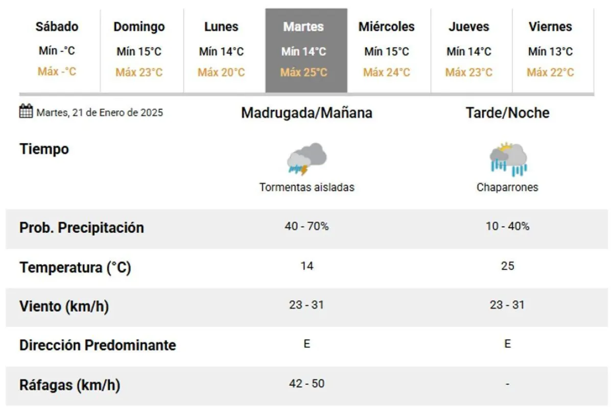 En cuanto al clima para los próximos días se anticipan tormentas aisladas durante la tarde y chaparrones en horas de la noche del martes. La temperatura máxima podría llegar a los 25ºC, lo que sugiere un cambio en las condiciones meteorológicas.
