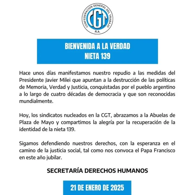 La CGT, en tanto, se sumó a la celebración y dijo "abrazar a las Abuelas de Plaza de Mayo". "Hace unos días manifestamos nuestro repudio a las medidas del Presidente (Javier Milei) que apuntan a la destrucción de las políticas de Memoria, Verdad y Justicia", recordó la central obrera.