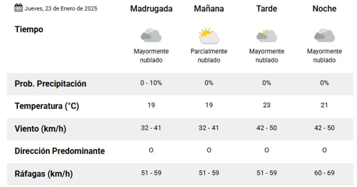 Durante la madrugada, se presentará mucha nubosidad con una temperatura mínima de 19 grados y vientos leves que oscilarán entre 51 y 59 kilómetros por hora. A medida que avance la mañana, se anticipa un leve asomo del sol, manteniendo la misma temperatura.