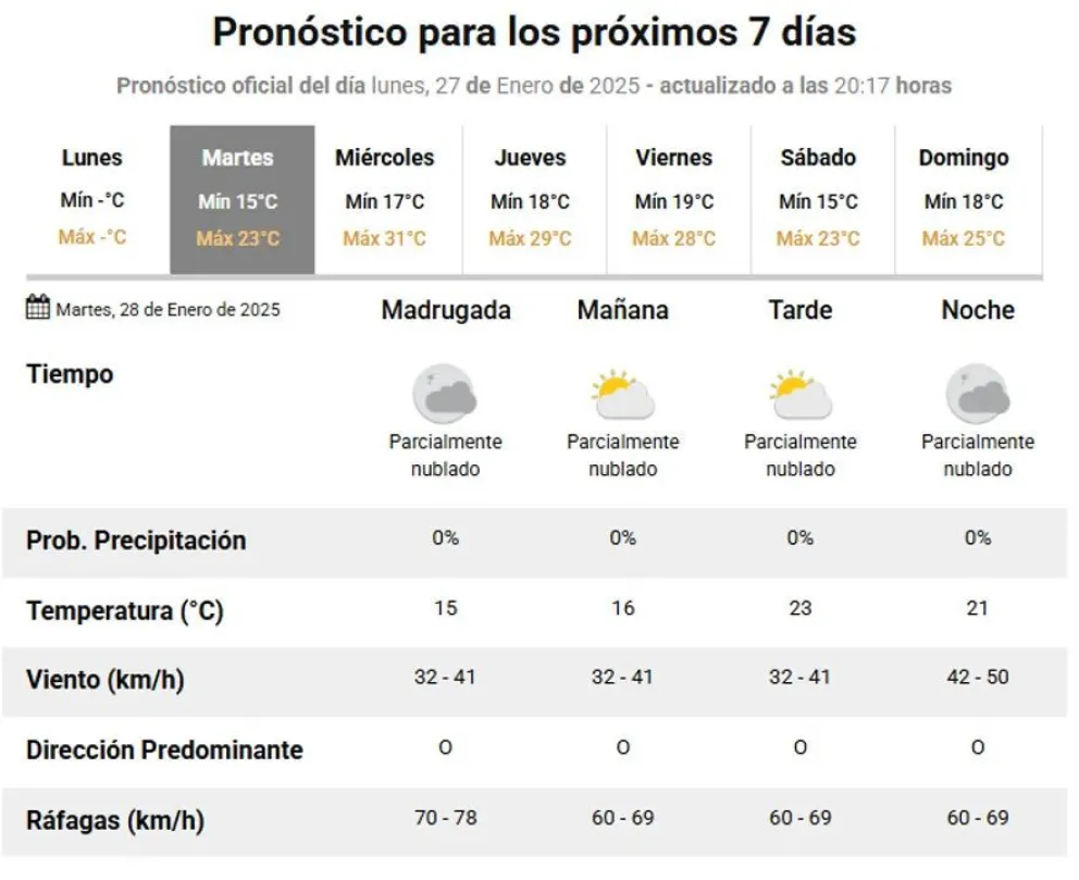 La temperatura mínima será de 15°C y la máxima alcanzará los 23°C. Durante la madrugada, el cielo estará parcialmente nublado, con ráfagas de viento de hasta 70 km/h.