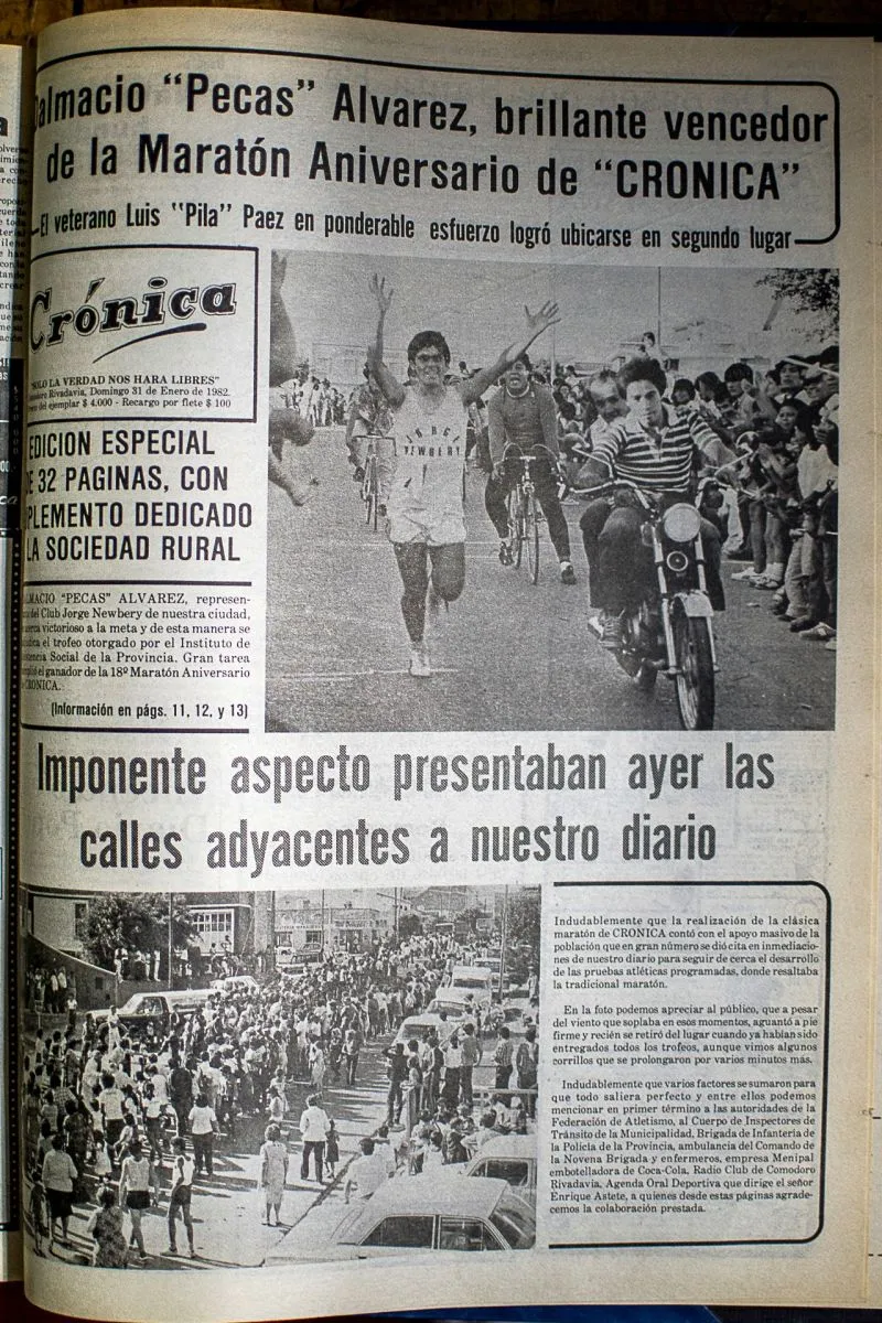 Enero de 1982. El atleta local Dalmacio "Pecas" Álvarez fue el gran ganador de la edición número dieciocho de la Corrida Internacional del Diario Crónica. Álvarez, entusiasmado, y casi sin poder creer su hazaña, traspasa la meta y es inmortalizado en una foto histórica que hoy perdura y cuenta una de las tantas historias que tiene el masivo evento deportivo que este año tuvo su edición número cincuenta y nueve.