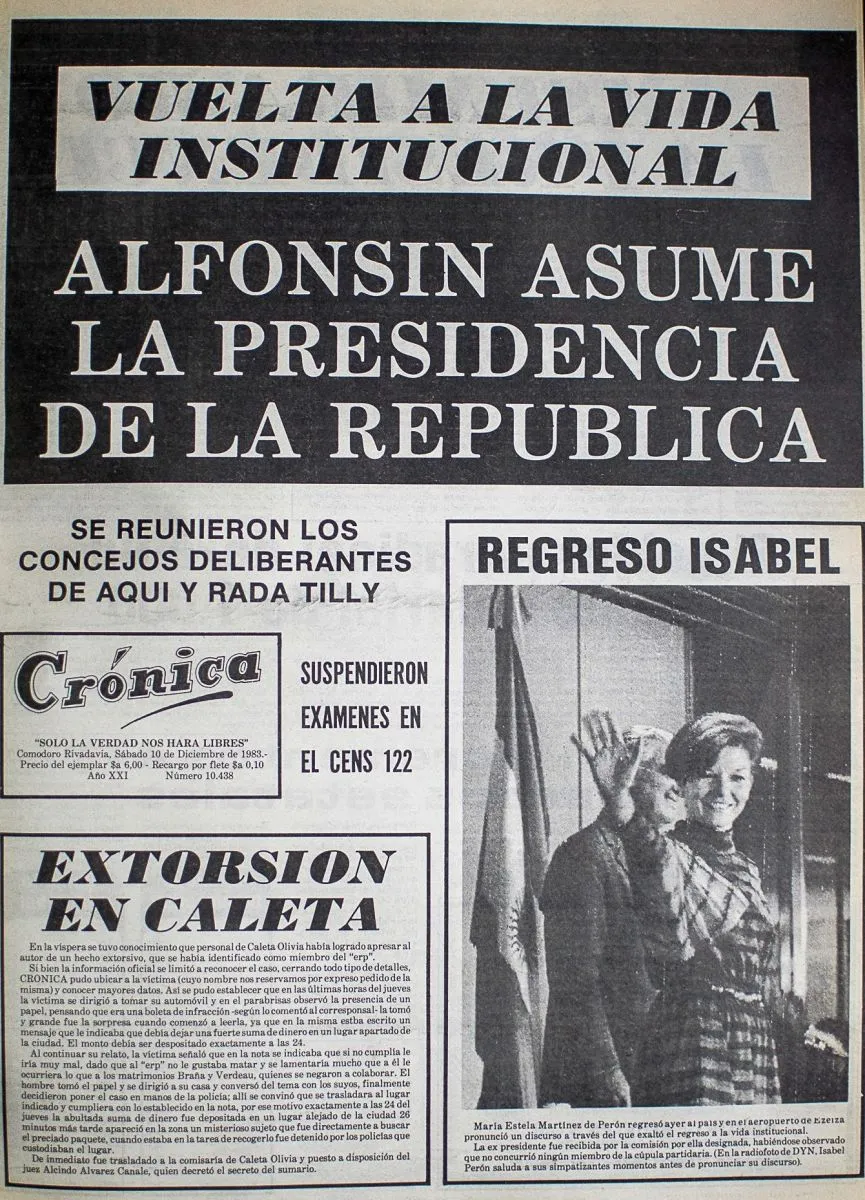 "Vuelta a la vida institucional. Alfonsín asume la presidencia de la República". Así dábamos cuenta de la asunción presidencial de Raúl Ricardo Alfonsín, el gran responsable de que Argentina volviera a vivir en democracia y dejara atrás uno de los periodos más oscuros de toda su historia. La derrota en la Guerra de Malvinas había sido la gota que había derramado el vaso. El gobierno de facto ya no tenía credibilidad. La gente estaba furiosa. Lo que había empezado como una gran hazaña, de pronto se había desmoronado, y el entusiasmo de la gente era algo que había desaparecido.