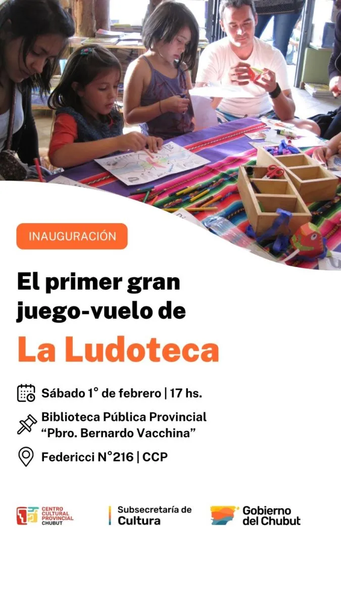 El Gobierno del Chubut, a través de la Subsecretaría de Cultura, invita a la comunidad a participar de la inauguración de una Ludoteca de la Biblioteca Pública Provincial “Presbítero Bernardo Vacchina” que se desarrollará este sábado a partir de las 17 horas en el Centro Cultural Provincial, ubicado en Federicci Nº216 de la ciudad de Rawson.