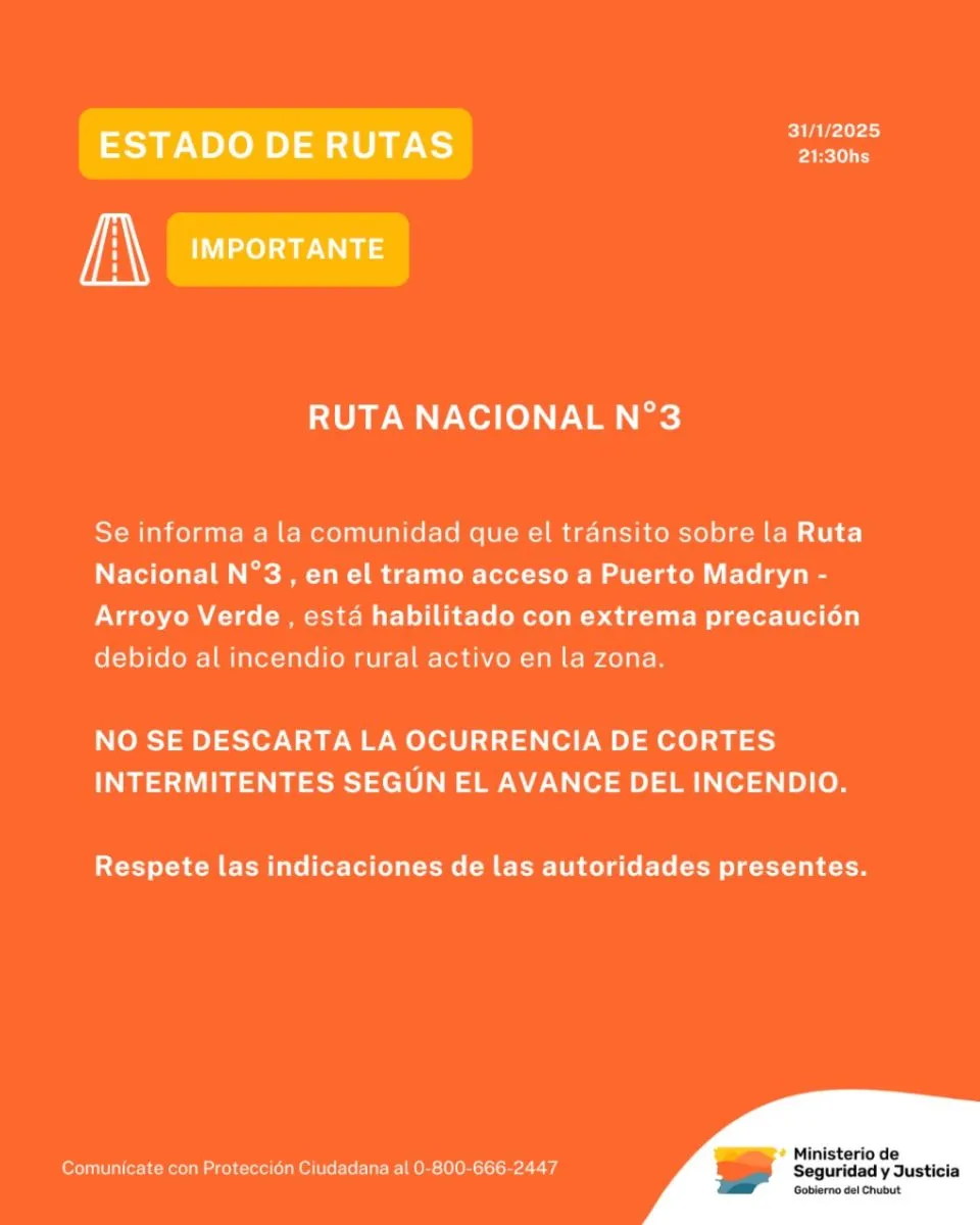 La Unidad Regional Puerto Madryn informó esta tarde que se había decidido cerrar el tránsito vehicular sobre la Ruta Nacional 3 Km 1357, específicamente a la altura de la Ruta 2, cruce hacia Puerto Pirámides en dirección norte. Asimismo, se había tomado la misma medida en el Puesto de Control Arroyo Verde, en dirección sur.