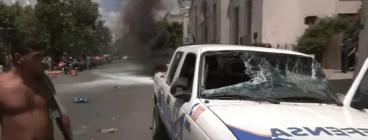 No solo arrojaron piedras contra el ingreso y las patrullas estacionadas afuera. Los manifestantes también atacaron a los policías y a la sede con neumáticos y conos.