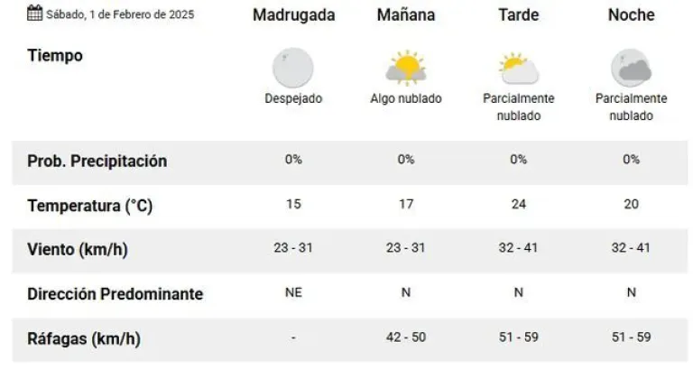 Durante la madrugada, se espera un cielo despejado con una temperatura mínima de 15°, sin viento ni probabilidad de lluvias. Por la mañana, las nubes comenzarán a aparecer, elevando la temperatura a 17°, con ráfagas leves del sector norte que oscilarán entre 42 y 50 kilómetros por hora.