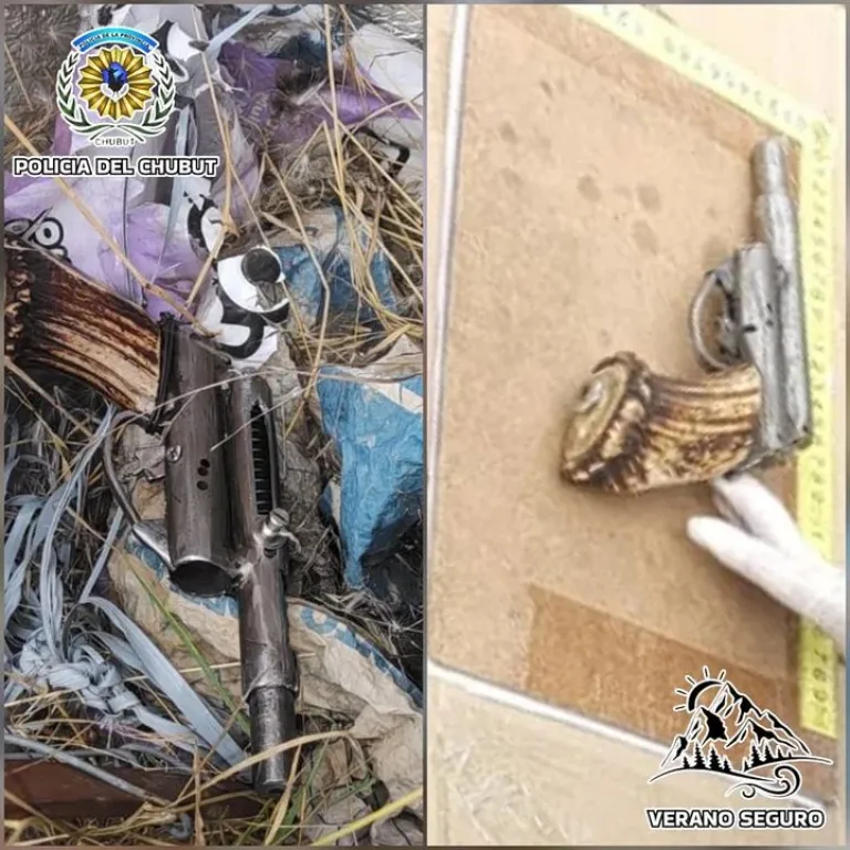 Los menores presentes, de entre 9 y 12 años, indicaron a los agentes el lugar donde el hombre había ocultado el arma. Tras la inspección, se halló un arma de fuego corta de fabricación casera, sin municiones.
