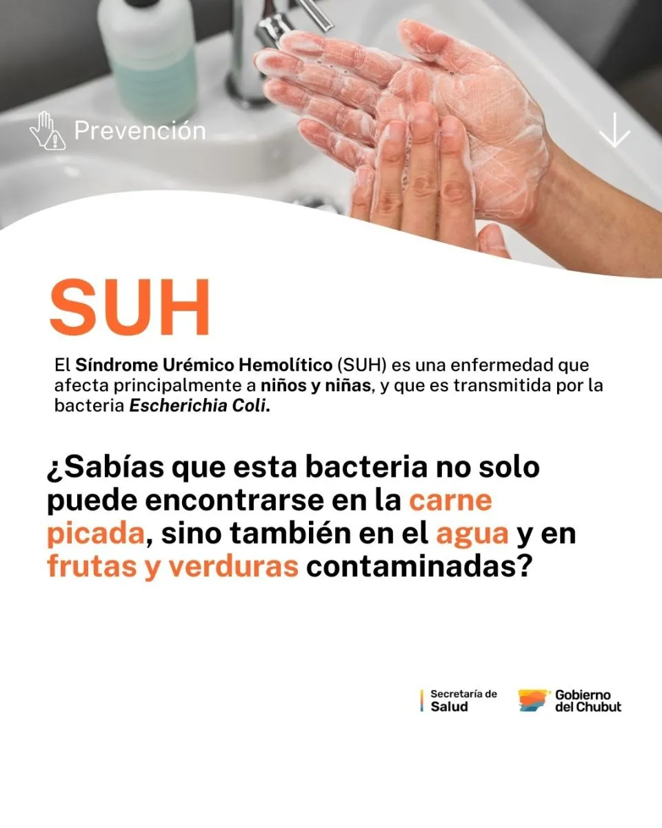 El Gobierno del Chubut, a través de la Secretaría de Salud provincial, solicita a la comunidad reforzar las medidas preventivas del Síndrome Urémico Hemolítico (SUH), debido al aumento de casos registrados de esta enfermedad durante lo que va de la temporada de verano.