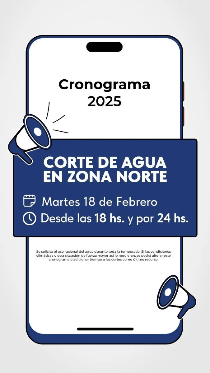 Hoy, martes 18 de febrero, desde las 18hs. y por un lapso de 24hs., se interrumpe el suministro de agua en Zona Norte; y mañana, miércoles 19 de febrero, desde las 18hs. y por 24hs., se interrumpe en Zona Sur y Central, para recuperar las reservas de Puesto La Mata.