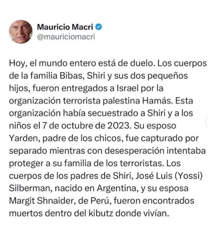 El expresidente Mauricio Macri se expresó en redes sociales sobre lo ocurrido este jueves y dejó su opinión al respecto: "hoy, el mundo entero está de duelo. Los cuerpos de la familia Bibas, Shiri y sus dos pequeños hijos, fueron entregados a Israel por la organización terrorista palestina Hamás. Esta organización había secuestrado a Shiri y a los niños el 7 de octubre de 2023", empezó diciendo el referente del PRO.