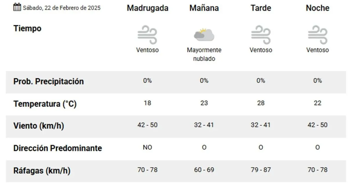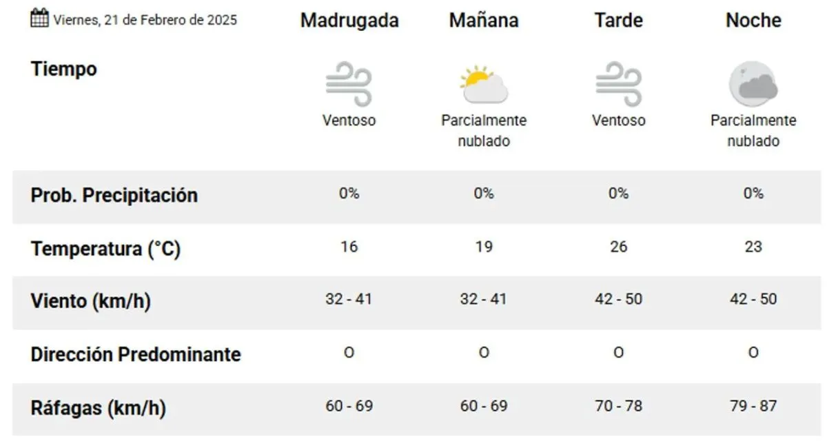 Para el sábado, se prevén condiciones similares con ráfagas fuertes y temperaturas cercanas a los 30°.