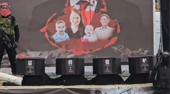 Los cuerpos (cuatro el jueves y uno el viernes) fueron entregados a la Cruz Roja. Los cuatro primeros, en una ceremonia llena de propaganda de Hamás -pese a los pedidos de la familia- en el área de Bani Suheila, en Khan Younis, al sur de Gaza, donde el grupo terrorista instaló un escenario cubierto con carteles que denunciaban que la familia Bibas fue asesinada por los bombardeos de Israel. Ya en noviembre de 2023, los terroristas habían esgrimido esa acusación e incluso hicieron grabar un video a Yarden Bibas responsabilizando al gobierno de Benjamin Netanyahu por la muerte de su familia y pidiendo una negociación urgente por los rehenes. Sin embargo, las FDI sostuvieron que los forenses llegaron a la determinación de que "basándose en pruebas forenses e información de inteligencia, los dos niños fueron 'brutalmente asesinados' por terroristas con sus propias manos en noviembre de 2023". En ese momento, Ariel tenía 4 años y Kfir apenas 10 meses.