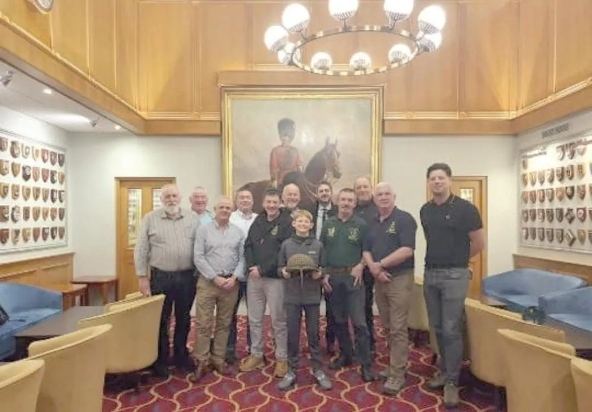 Veteranos de guerra británicos entregan el casco en Jack Club de Londres. Lo recibe Agustín Vázquez, quien lo recibió en nombre de Raúl Guerreiro, quien no pudo viajar a Inglaterra.