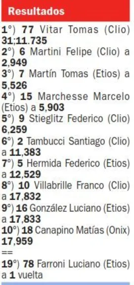 El epílogo fue electrizante y Vitar pudo contener el intento de Martini en una maniobra al límite para imponerse en La Plata. Martín arribó en el último escalón del podio, Marchesse concluyó cuarto, Federico Stiglitz fue quinto, González sexto, Santiago Tambucci séptimo, Federico Hermida octavo, Villabrille noveno y Canapino décimo.