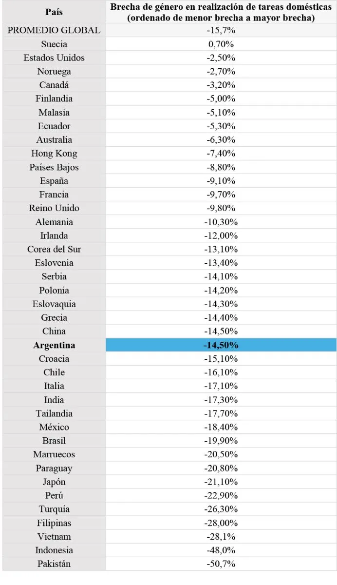 Argentina y América Latina: Con excepción de Ecuador, la mayoría de los países de la región presentan una brecha considerable en la distribución equitativa de las tareas domésticas, en línea con el promedio global (-15,7%). En Argentina, la brecha es del -14,50%, en Chile alcanza el -16,10%, mientras que en México y Brasil supera ligeramente el promedio global, con -18,40% y -19,90%, respectivamente. En Perú y Paraguay, la brecha es aún más pronunciada, superando el promedio global.