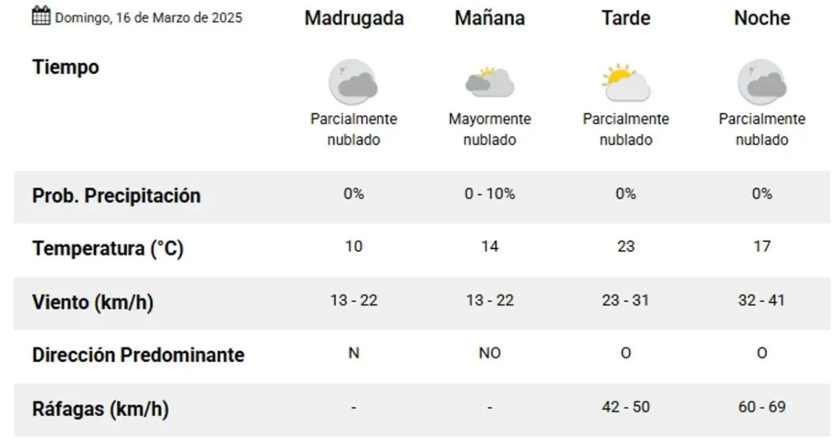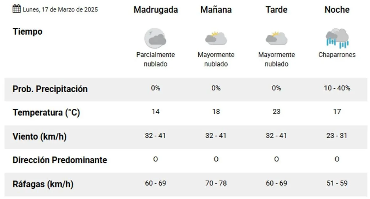 Al caer la noche, la temperatura descenderá a 17°, mientras que las ráfagas de viento se intensificarán, alcanzando entre 60 y 69 km/h.
