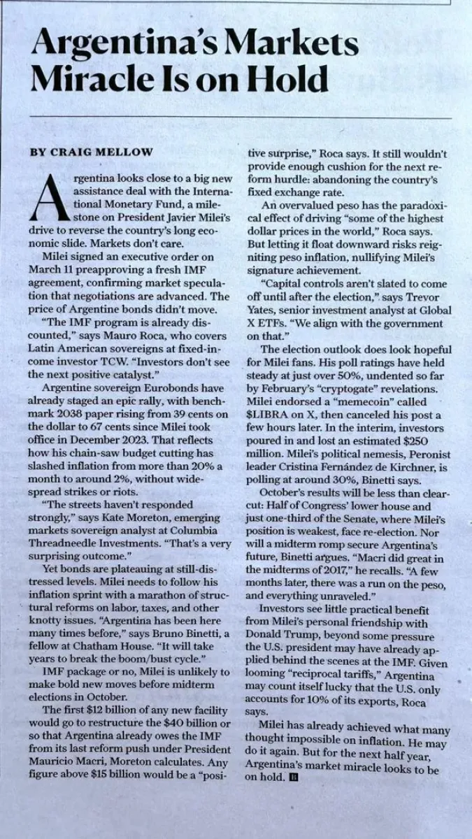 El artículo, titulado "El milagro del mercado argentino está en suspenso", resalta que los bonos soberanos han experimentado una fuerte recuperación desde diciembre de 2023. Por ejemplo, el bono de referencia con vencimiento en 2038 pasó de 39 a 67 centavos por dólar, reflejando el optimismo del mercado. Además, el ajuste fiscal permitió una reducción de la inflación mensual del 20% al 2%, algo que el medio califica como un logro significativo.