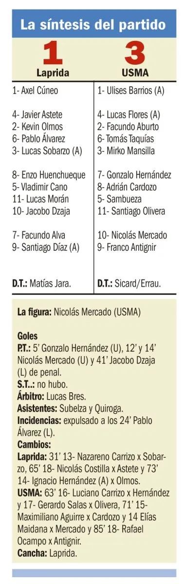 El Canario, en medio de la desazón, intentó reaccionar y hasta estrelló un remate en el caño, pero mostró pocos recursos ante un USMA que controló el juego en general. La expulsión de Pablo Álvarez complicó aún más a Laprida. Sin embargo, el ingreso de Nazareno Carrizo y el cambio a una línea de tres en el fondo le permitieron al equipo local reordenarse.