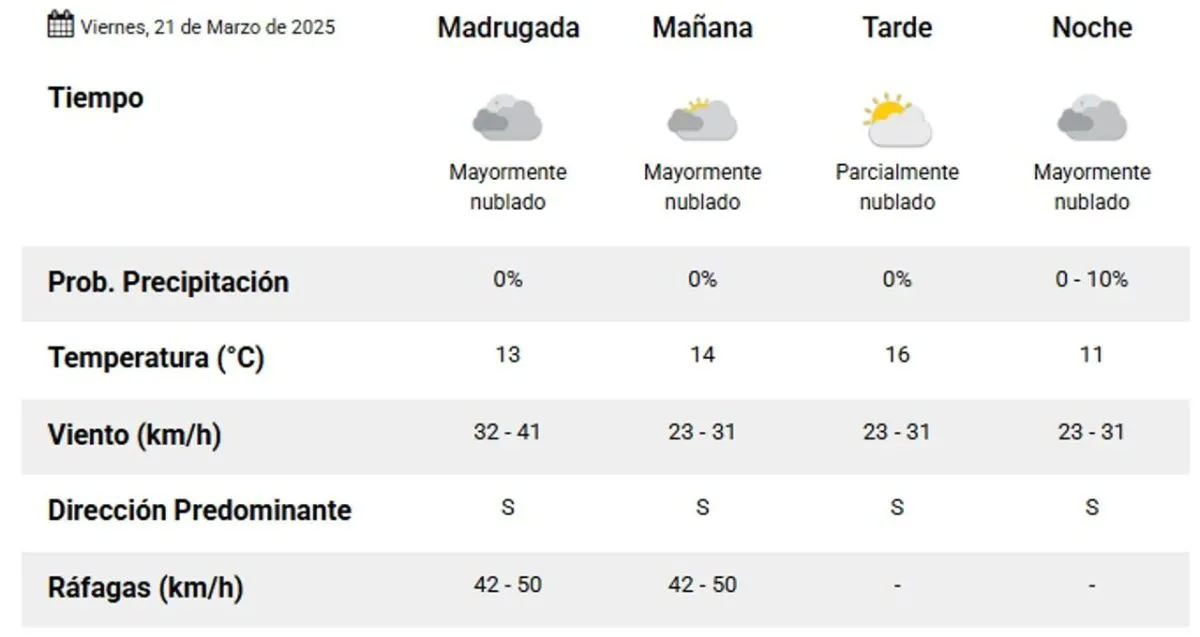 Por la madrugada la mínima será de 11°, con nubosidad abundante, mientras que llegando la mañana y promediando la tarde, la temperatura alcanzará los 19°, con algunas ráfagas de viento del sector sur a 23 km/h. y algo de sol, pero el viento disminuirá.
