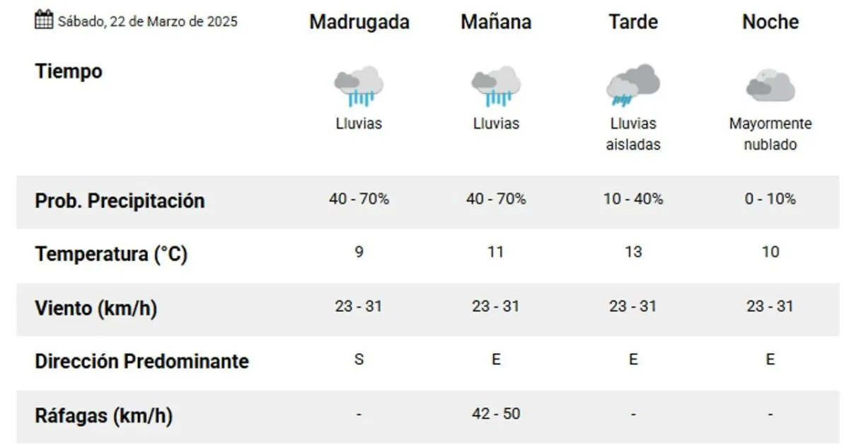 Para el día sábado, se anticipa un clima más frío y lluvioso, con una máxima de 13° y probabilidad de lloviznas. Las ráfagas de viento serán provenientes del este a 21 km/h.