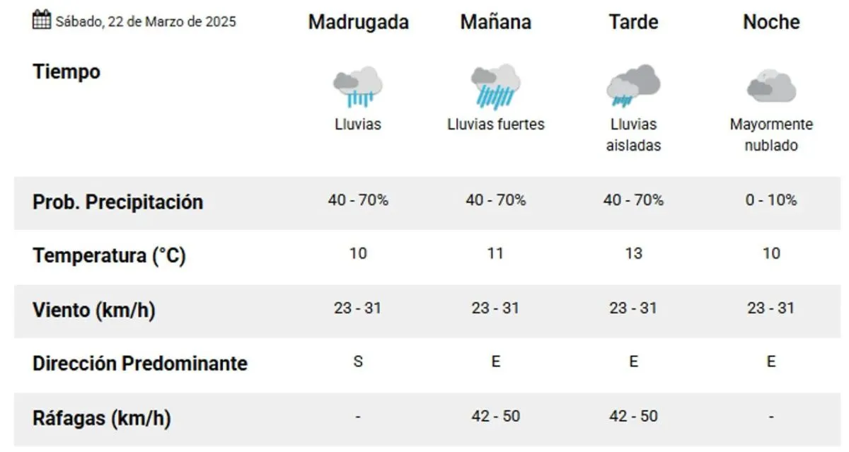 Durante la madrugada, se prevén lluvias con una temperatura mínima de 10°, sin viento. Sin embargo, a medida que avance la mañana, la intensidad de las precipitaciones aumentará, elevando la temperatura a 11° y generando ráfagas de viento del mar que oscilarán entre 42 y 50 kilómetros por hora.